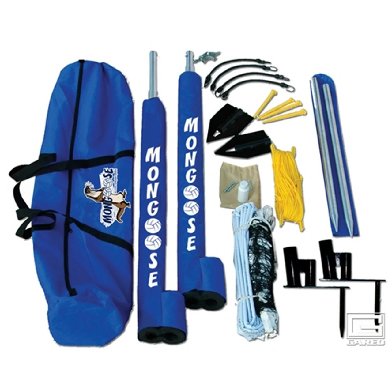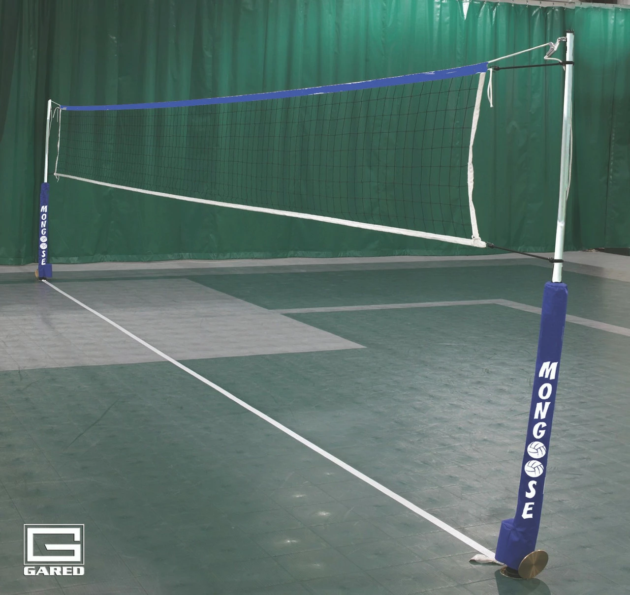 Gared’s Mongoose Wireless Portable Volleyball System is one of the most innovative portable volleyball systems on the market today. The Mongoose is versatile and portable for play in grass, sand, or indoors, making it ideal for institutional as well as residential use. With its exclusive tension-operated design and patented two-stake in-ground plate system, the Mongoose is sturdy and durable for all levels of play, and there are no dangerous guy wires for players to trip over. The uprights are constructed of high-strength telescopic aluminum for long life in outdoor settings. The poles can be easily adjusted for men’s, women’s, and junior’s heights by loosening the net, easily adjusting the pole pins, and then re-tightening the net. Durable protective post padding is included to protect players from injury. The Mongoose system includes two sand wedge adapters for optional play in the sand or at the beach. There are several options available for indoor installation, including a floor kit to use with floor anchors, and adapters to allow the posts to work with 3, 3-1/2 or 4 inch floor sleeves, all at additional cost. Floor anchors and floor sleeves also are available if requested.